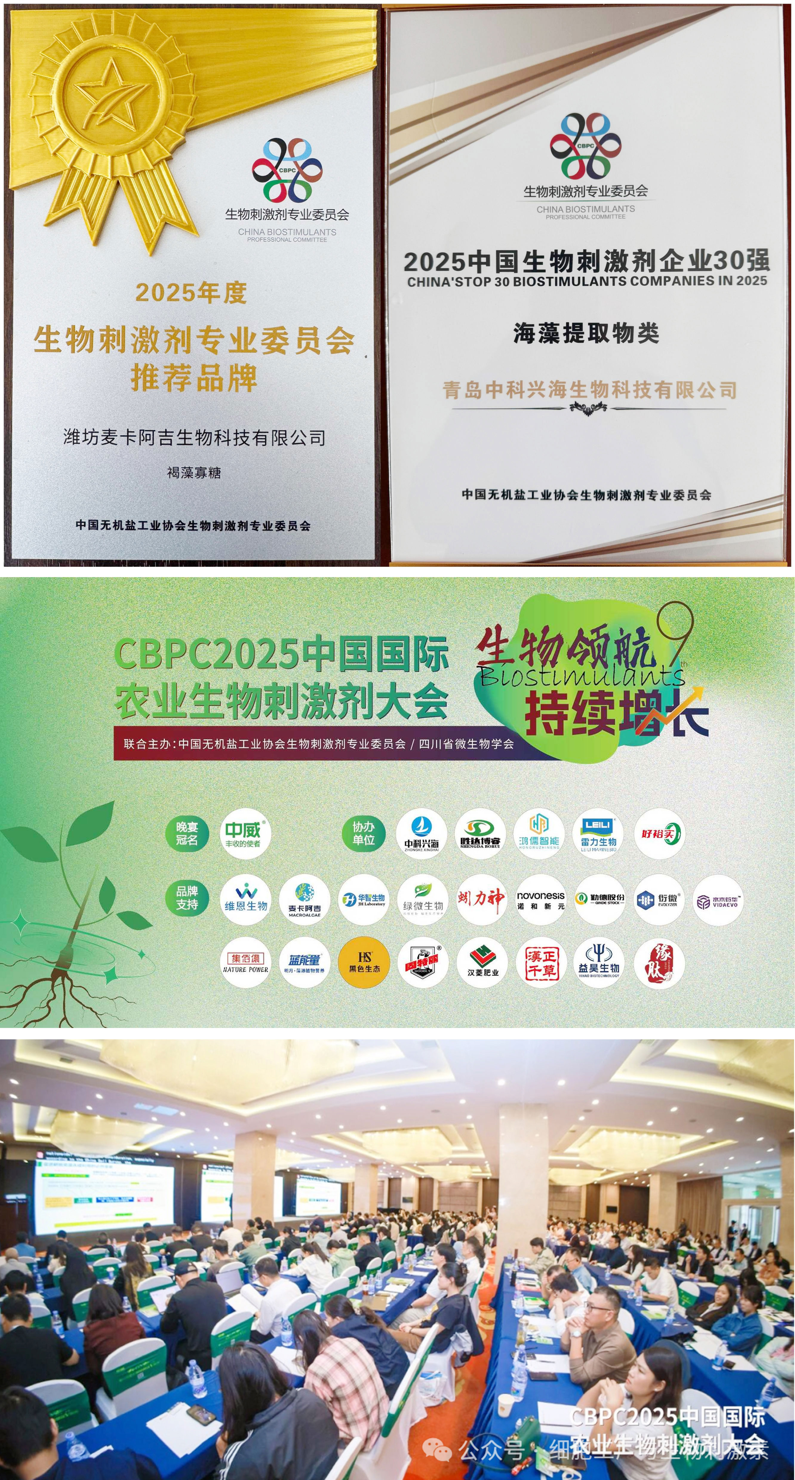 2025年10月16日至18日,第九届中国国际农业生物刺激剂大会(CBPC 2025)在四川成都盛大召开。本次大会以"生物领航 持续增长"为主题,汇聚全球行业智慧,聚焦技术创新与成果转化。潍坊麦卡阿吉生物科技有限公司(中科兴海)凭借突出的技术实力与市场影响力,成功入选"2025中国生物刺激素企业30强",并作为品牌支持单位深度参与大会各项议程。